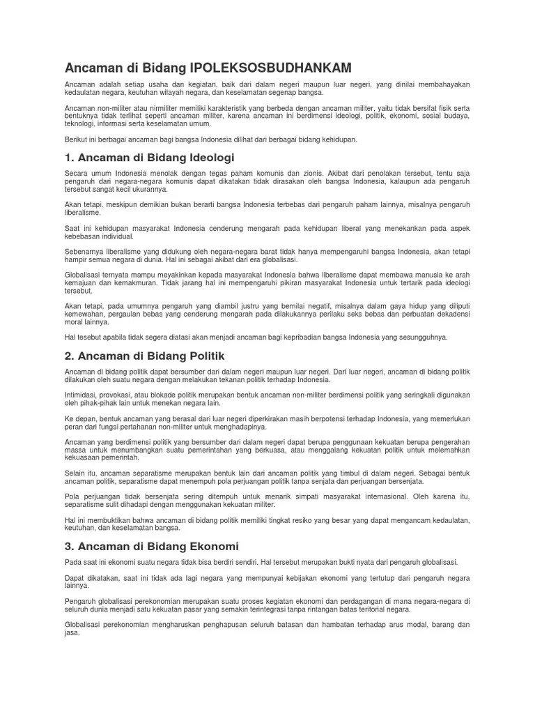 Kasus ancaman di bidang ipoleksosbudhankam draft ancaman di bidang ipoleksosbudhankam. Penyebabnya, kemajuan ilmu pengetahuan dan teknologi ancaman sosial budaya dari luar munculnya gaya hidup konsumtif muncul sifat hedonisme munculnya gejala westernisasi.