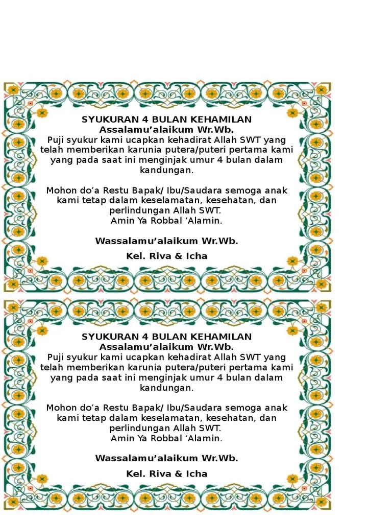 Memasuki usia kehamilan 4 bulan, rinni wulandari menggelar pengajian. Kartu ucapan 4 bulanan kehamilan. Errika ayu tasyakuran 4 bulan kehamilanku c. Jual kartu ucapan label untuk syukuran kehamilan 4 7 bulanan 7 5 x 5 cm. Untuk kali ini saya akan share tentang download template undangan syukuran 4 bulanan atau sering di sebut tasyukuran mapati (4 bulan usia kandungan) cdr, .